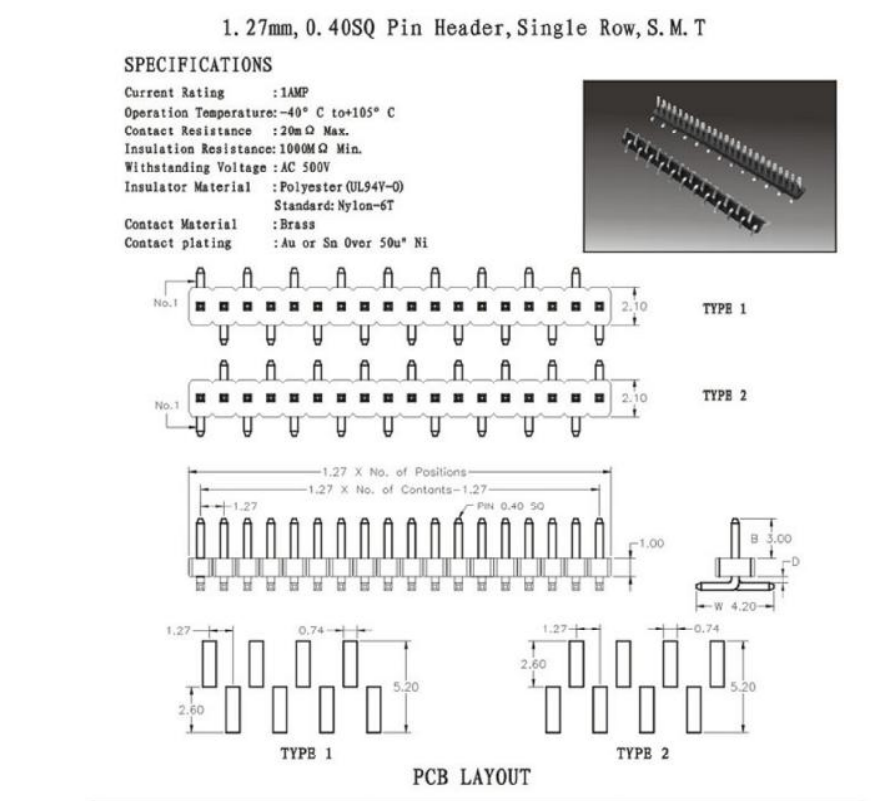 排针1.27mm0.40SQ Pin HeaderSingle RowS.M.T