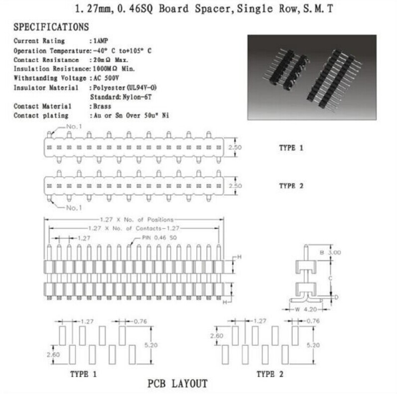 排针1.27mm0.46SQ Board SpacerSingle RowS.M.T
