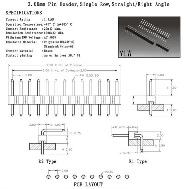 排针2.00mm Pin Header,Single Row,Straight/Right Angle