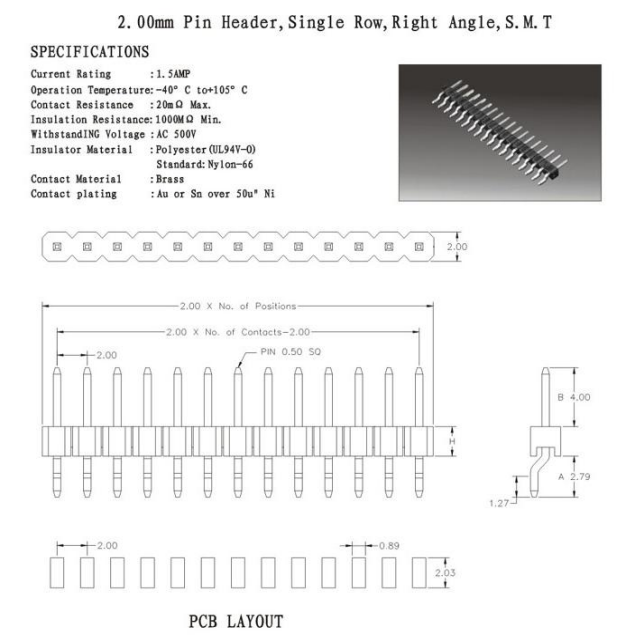 排针2.00mm Pin Header,Single Row,Right Angle,S.M.T